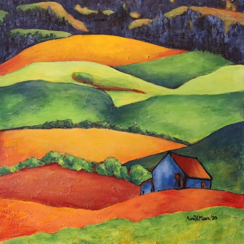 Anne Heather Moore is a painter originally from England who has lived in Ottawa, Canada for many years. Working primarily in acrylics, she creates landscapes, streetscapes, and figurative works that explore colour, movement, and light, often inspired by the changing seasons and landscapes of rural Ontario.