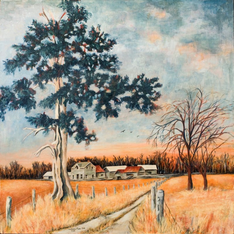 An old log farm as dusk is falling.