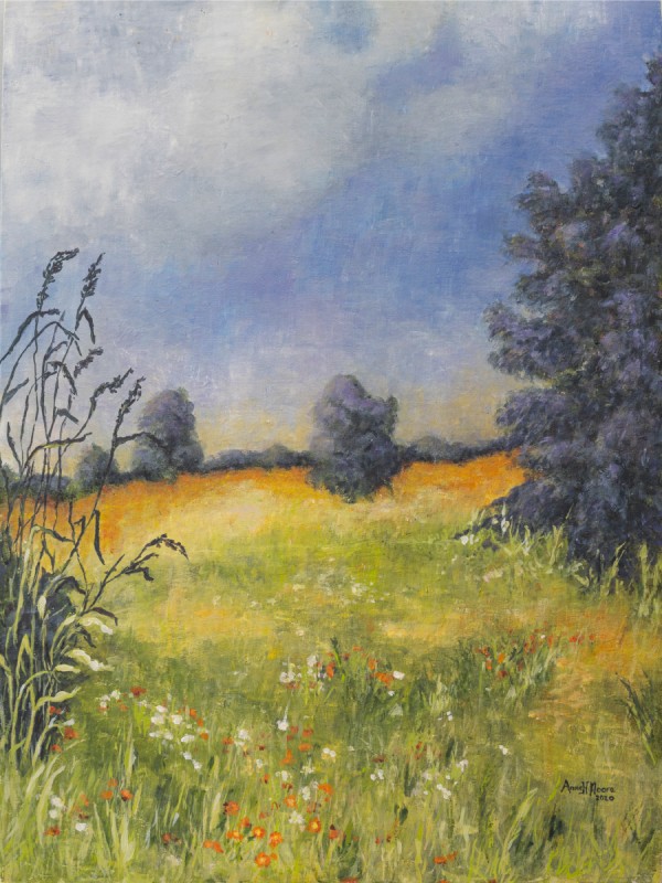 A painting of my backyard. The little plant known as Indian Paintbrush is flowering in profusion.