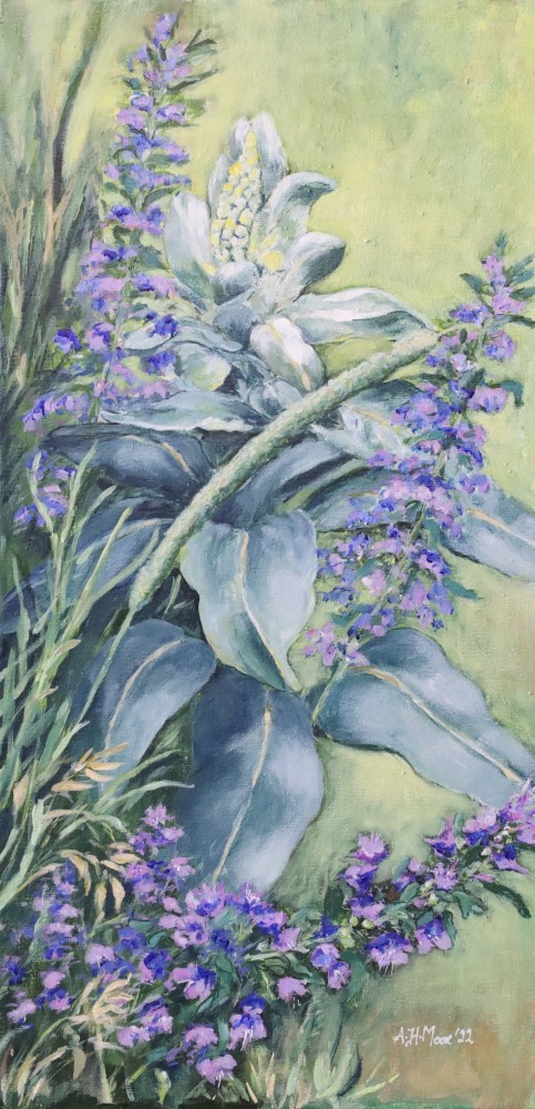 Some wild flowers in my garden featuring Mullein, Viper’s Bugloss and various grasses. Painted in subdued colours of blue and green.