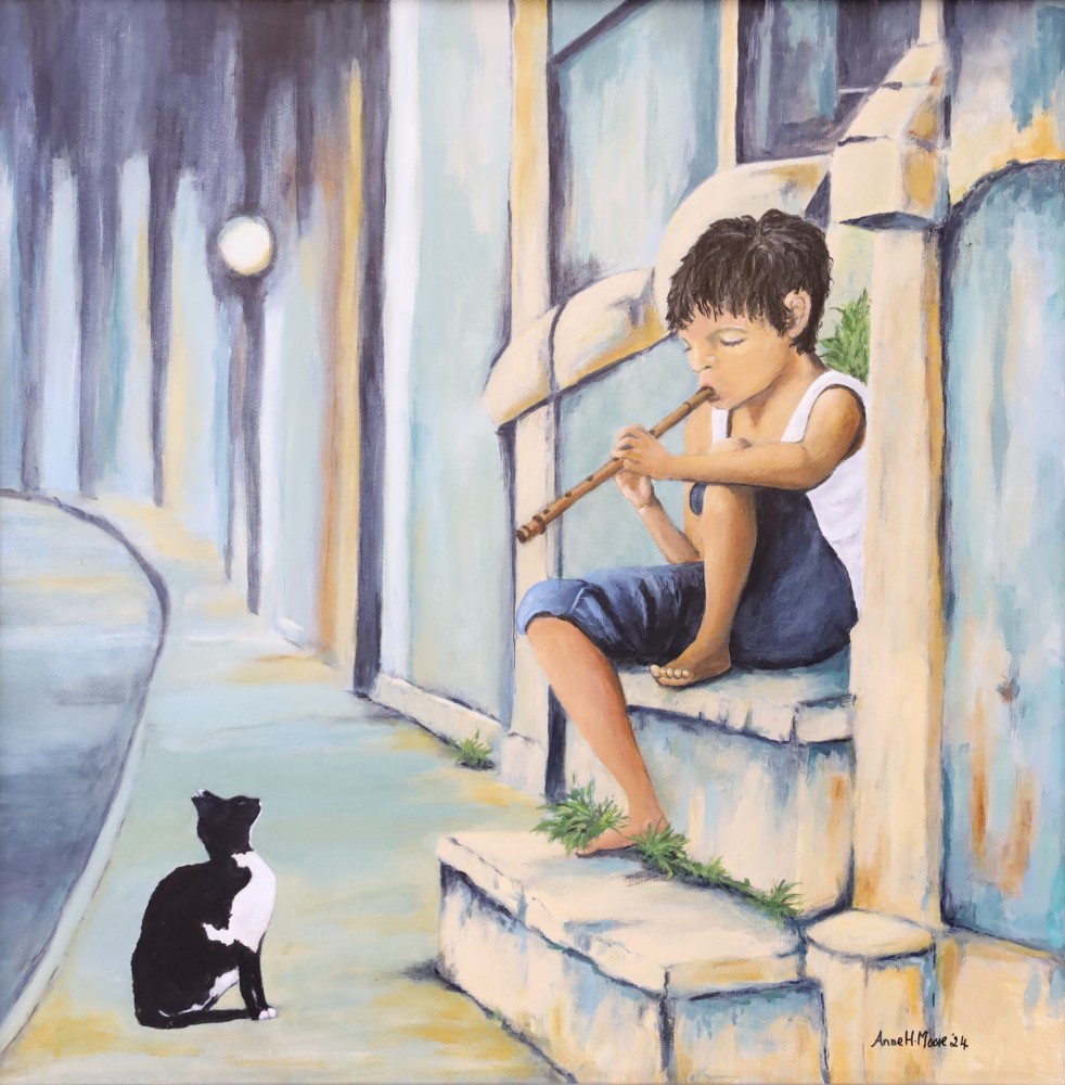 This is a painting of a young boy playing a recorder, sat on steps in a small town in Italy. The cat is sat transfixed by the sound of the music. I named it after my grandson and one of my cats.