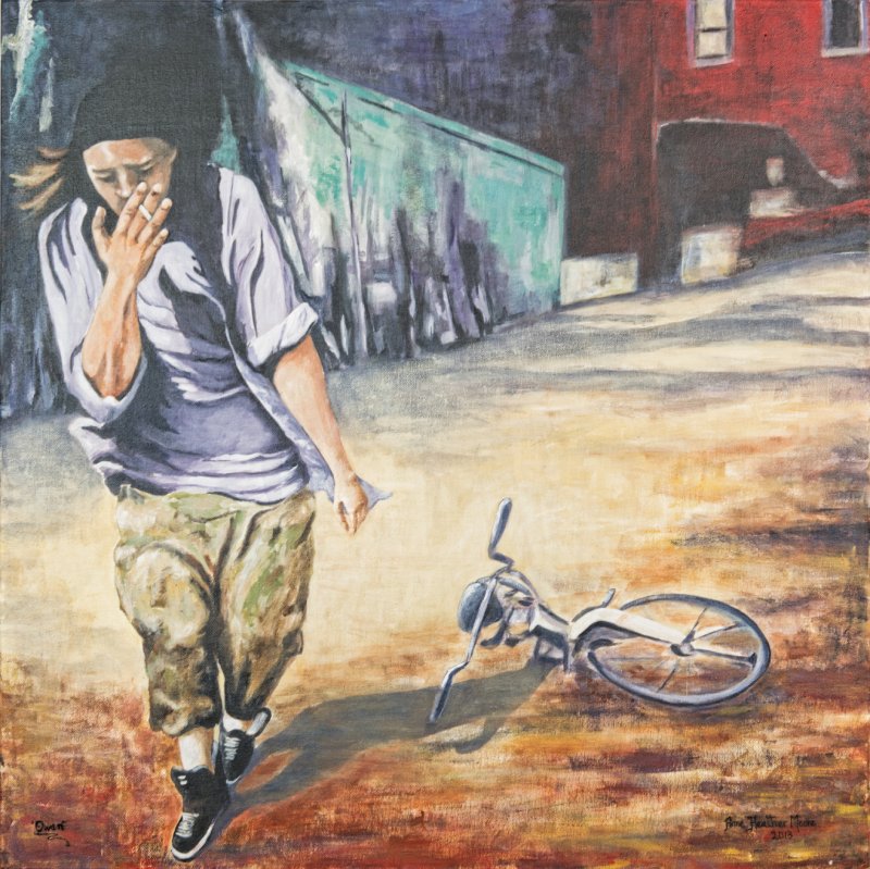 I called this painting a teenage wasteland because it seemed to me that it epitomized the life of many teenagers as they struggle to grow up. The childhood bike thrown down and the cigarette in his mouth.