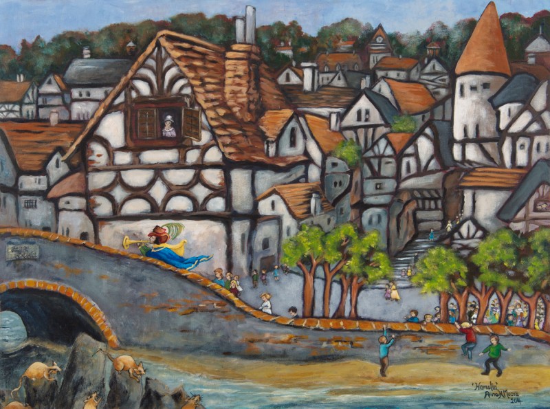 A fanciful painting based on the poem ‘The Pied Piper of Hamelin’. Painted for some children.